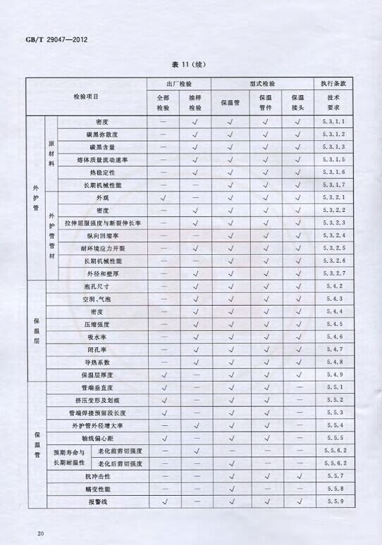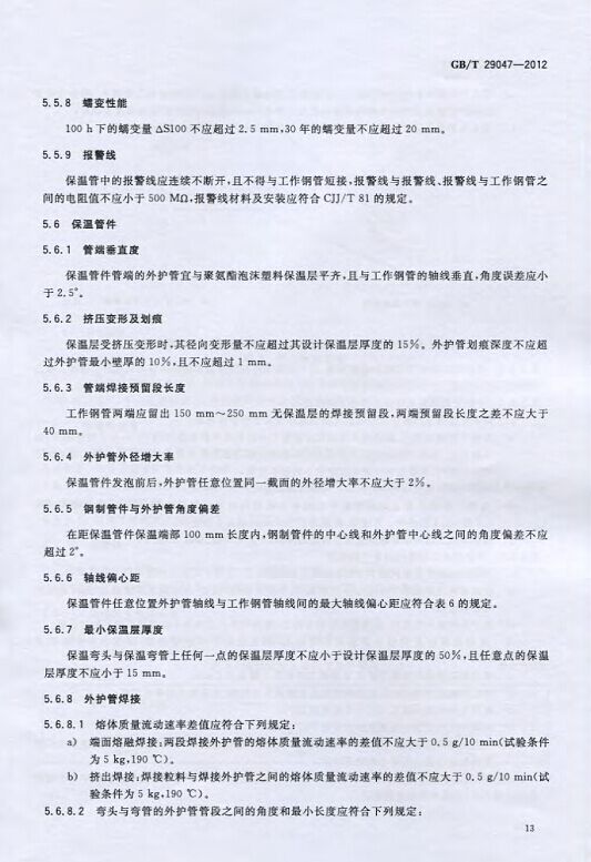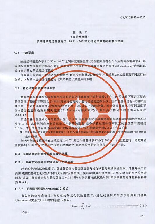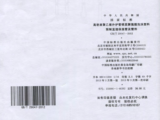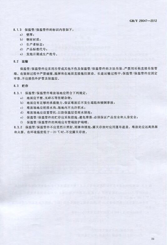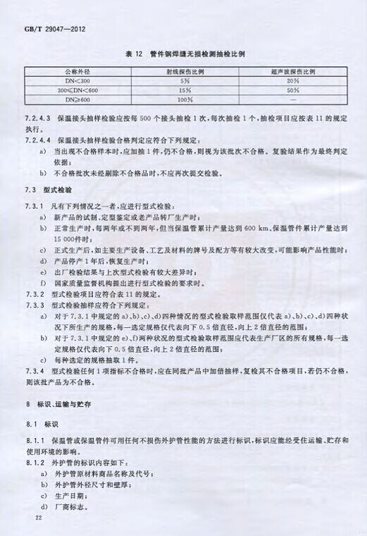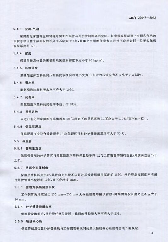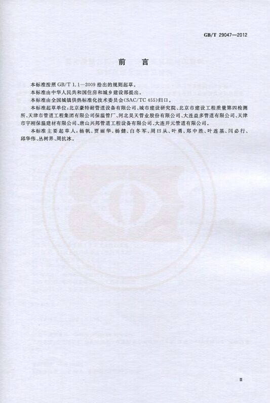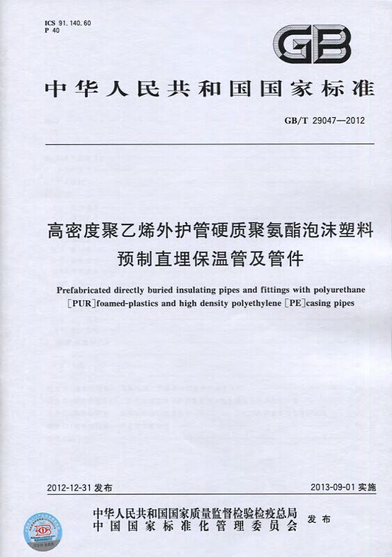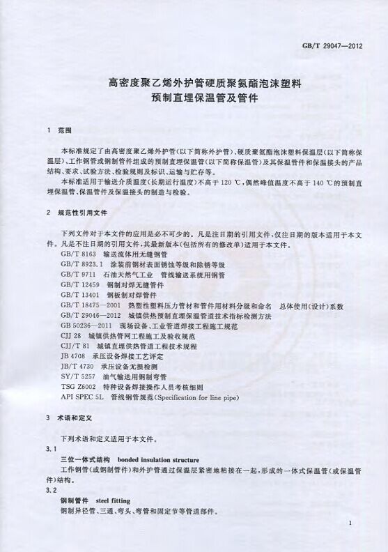 GB/T29047-2012 高密度聚乙烯外護管硬質聚氨酯泡沫塑料預制直埋保溫管及管件國家標準 來源:焱森高科裝備 日期:2016/5/3 瀏覽次數:1667 GB/T29047-2012 高密度聚乙烯外護管硬質聚氨酯泡沫塑料預制直埋保溫管及管件國家標準 上一篇:本公司生產的高密度聚乙烯預制直埋保溫管 上一篇:保溫鋼管的結構機理 分享到:0 用手機看 拍下二維碼,信息隨身看 試試用微信掃一掃,在你手機上繼續觀看此頁面。